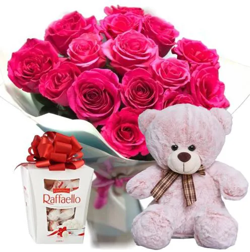 • Средний - кустовая хризантема - 15 шт., лента + Raffaello + игрушка 30 см