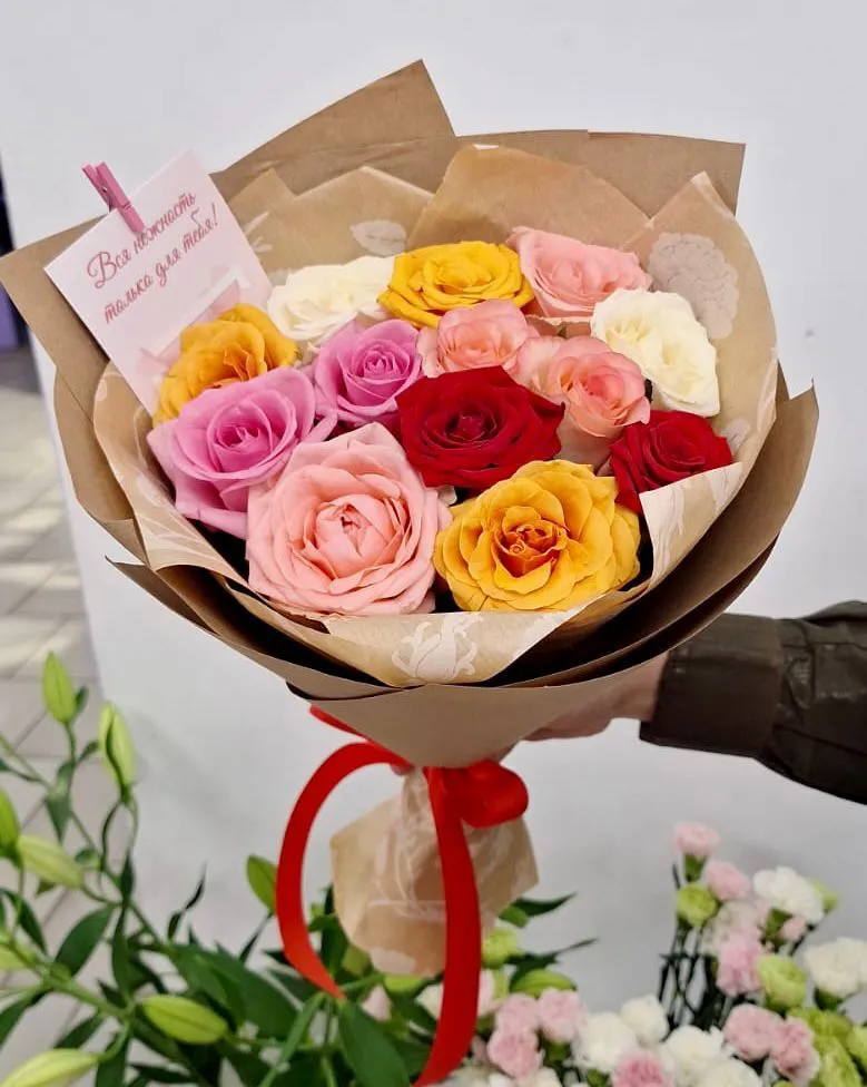 Состав букета: разноцветные розы, упаковка, лента