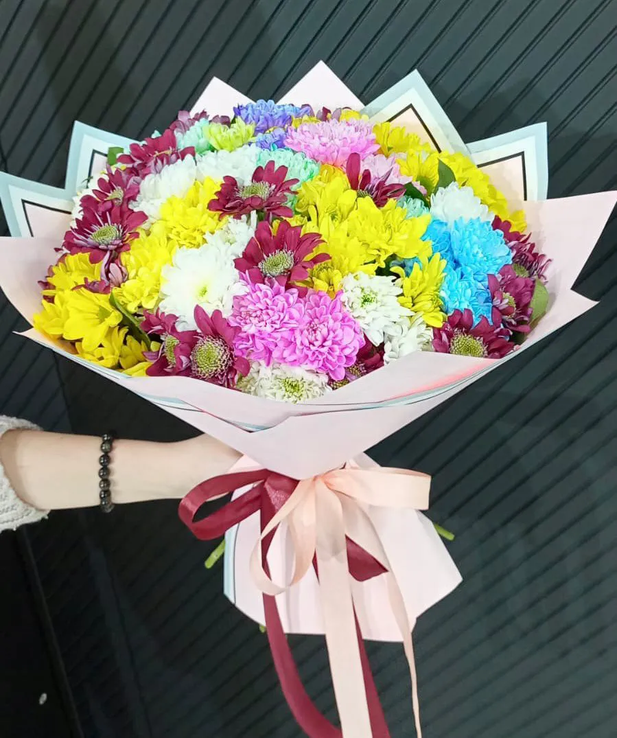 Состав букета: разноцветные хризантемы, упаковка, лента