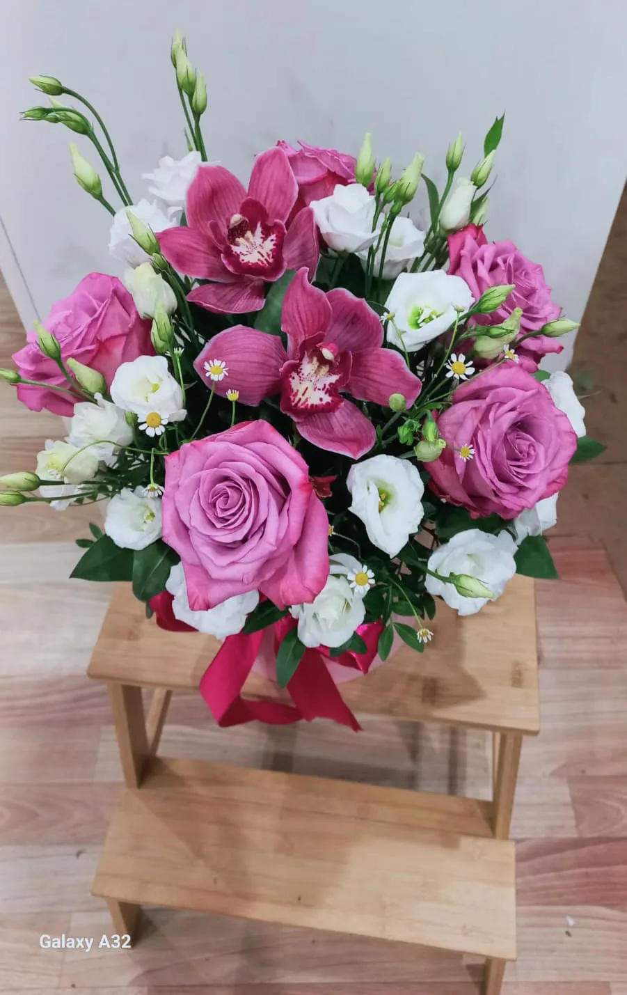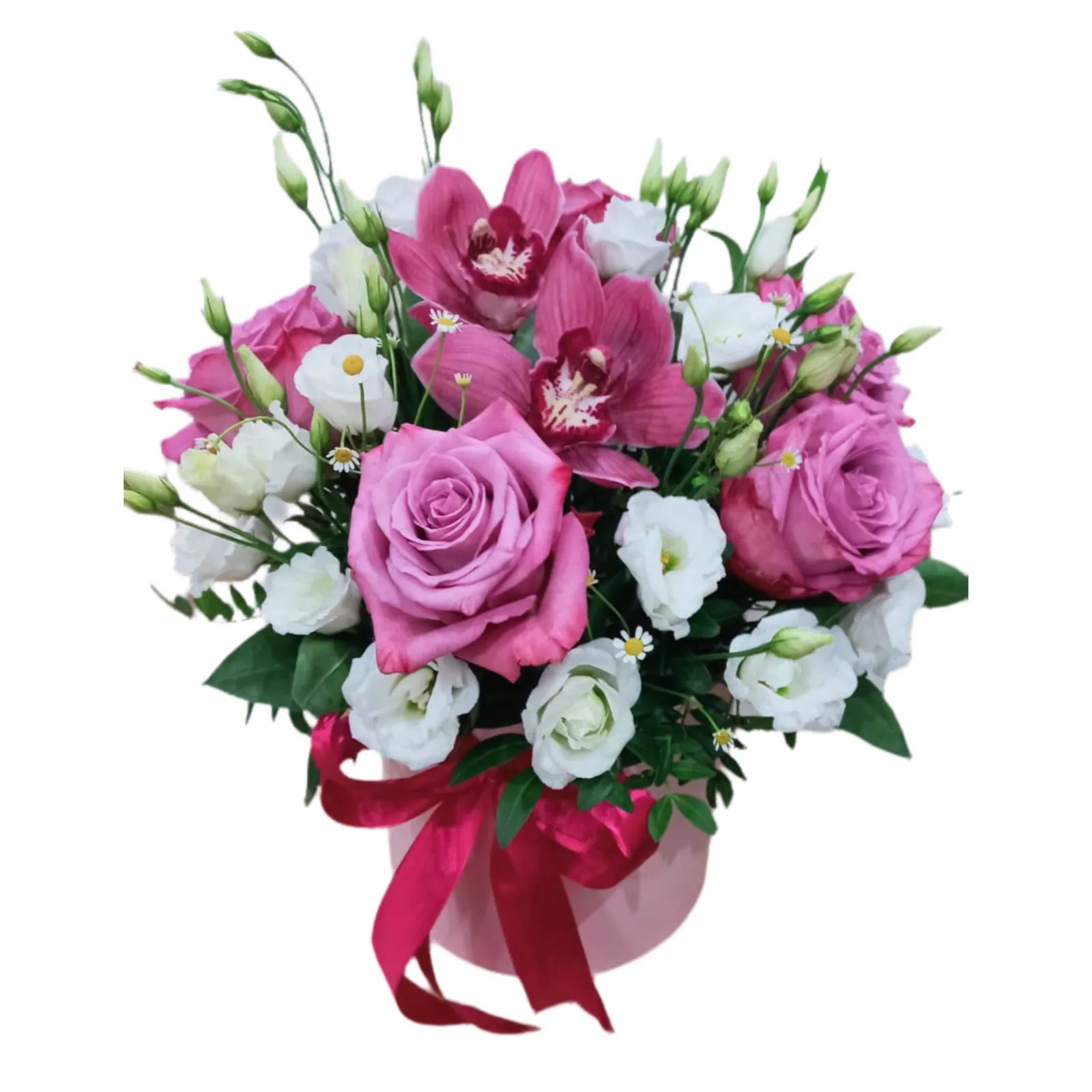 • Стандарт на фото (роза - 5 шт., орхидея - 2 шт., эустома - 3 шт., оазис, корзина)