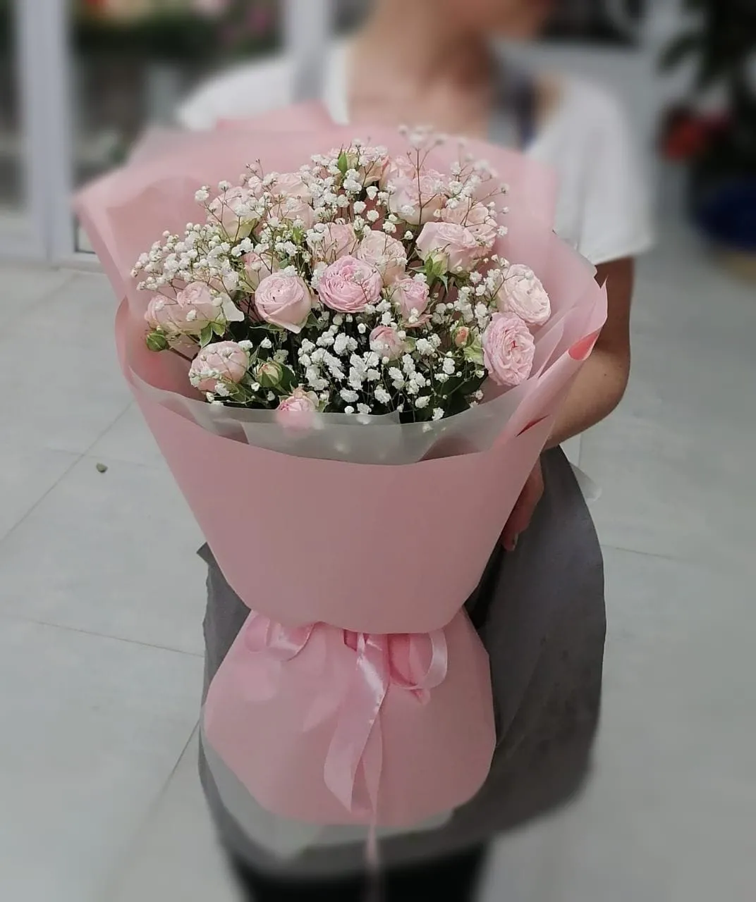 • Экстра - роза кустовая - 15 шт., гипсофила, упаковка, лента