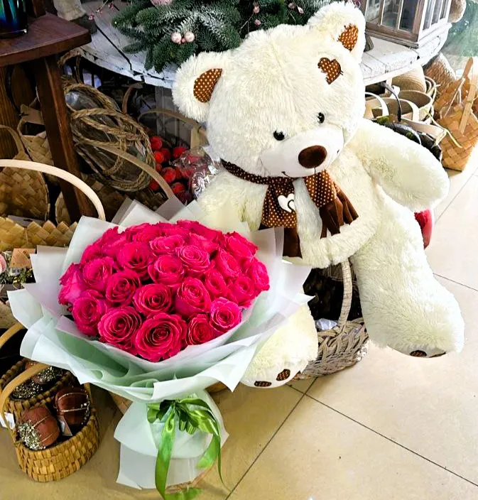 Большой мишка добавляет в этот букет особую нотку уюта. Представьте, как приятно получить в подарок мягкого друга, который будет всегда рядом, обнимая и согревая своим теплом. Такой мишка станет символом ваших теплых чувств и станет отличным компаньоном для уютных вечеров.