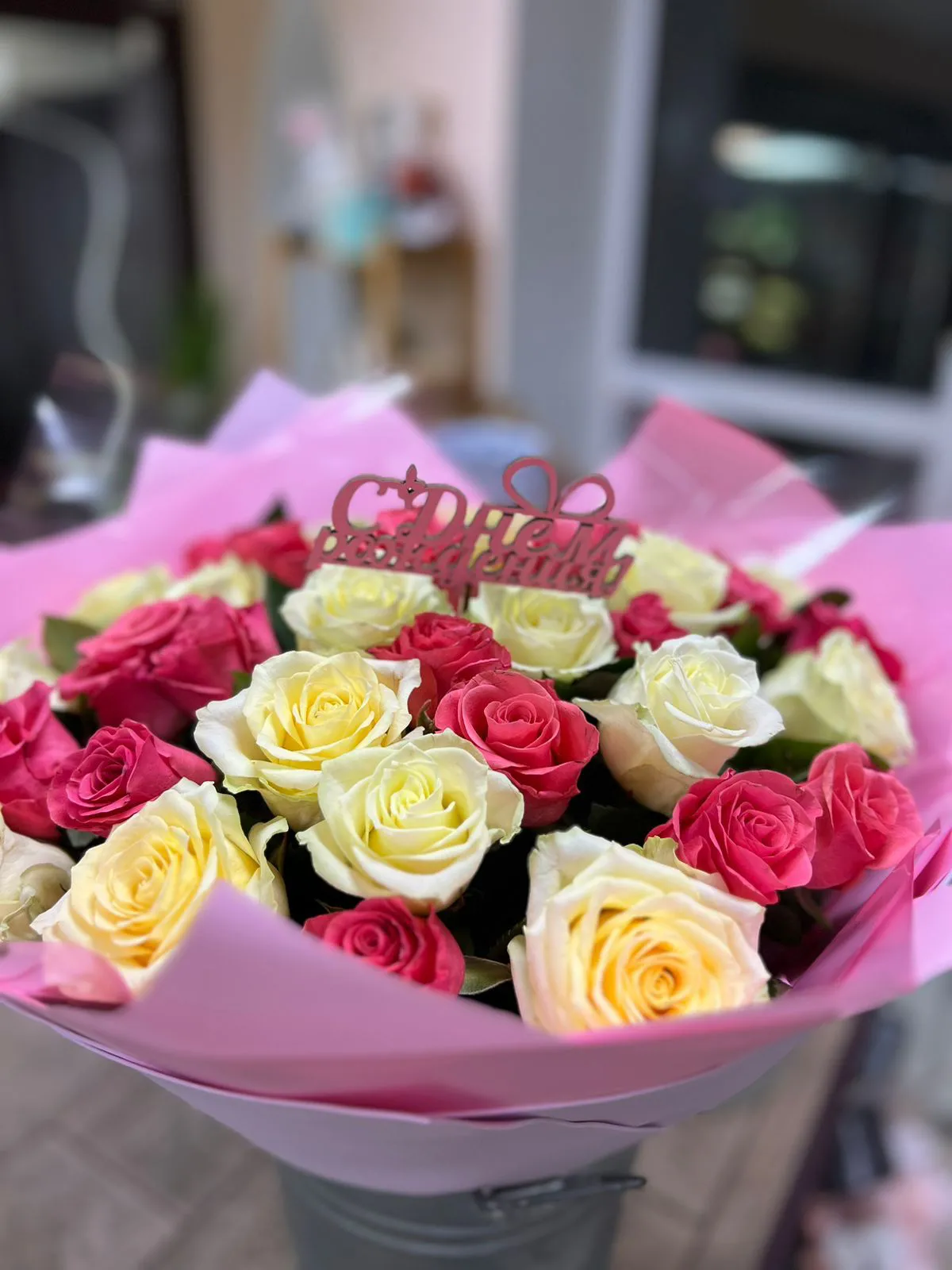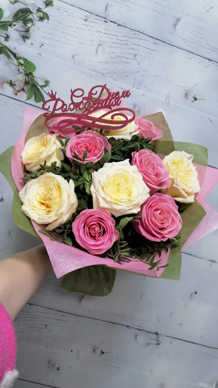 Букет из розовых и белых роз С Днем Рождения