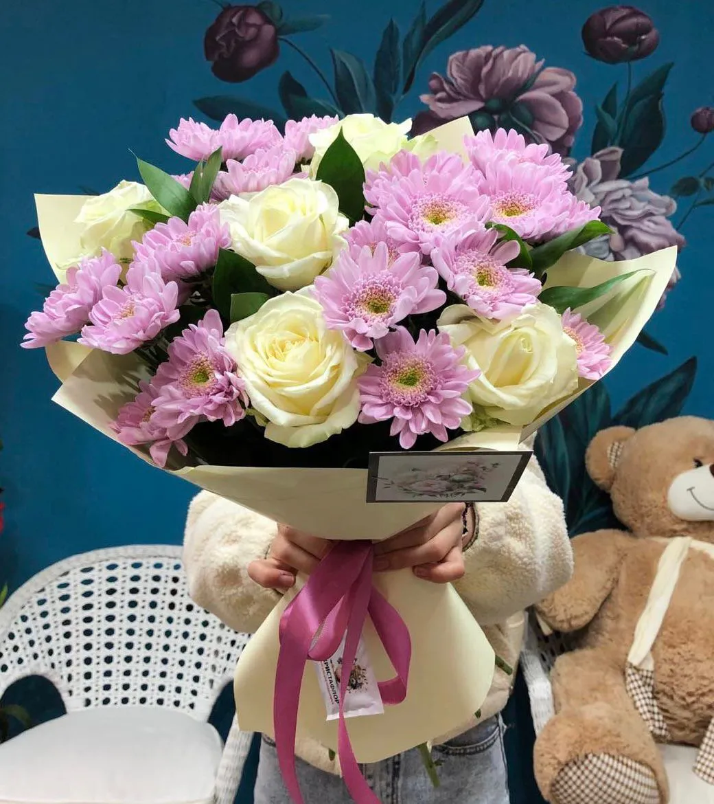 • Стандарт (Кустовая хризантема 4 шт,, роза 5шт, зелень, упаковка, лента)
