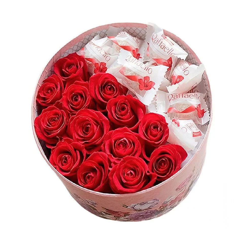 - Состав: роза - 11 шт., оазис, коробка, коробка конфет Raffaello (150 гр.)