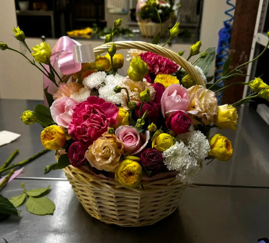 Все эти цветы искусно уложены в плетеную корзину, которая сама по себе является украшением, а нежный розовый бантик завязывает всю композицию, придавая ей завершенность и очарование. Эта цветочная корзина станет идеальным подарком для любого праздника, наполняя сердца радостью и светом.