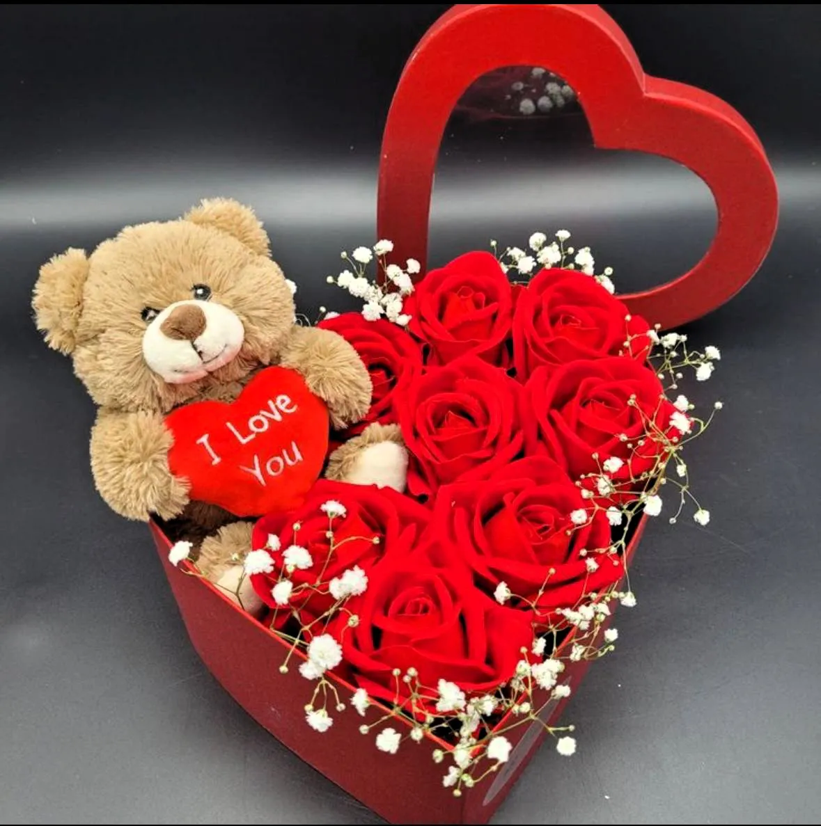 • Стандарт - розы - 9 шт. ,гипсофила, игрушка, топпер, оазис, коробка