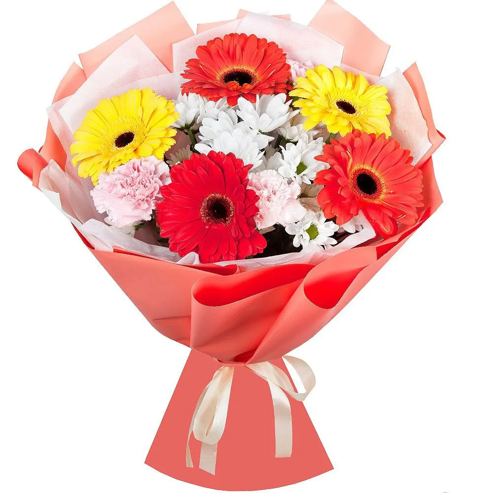 • Средний (5 гербер, 2 кустовые хризантемы, 2 гвоздики)