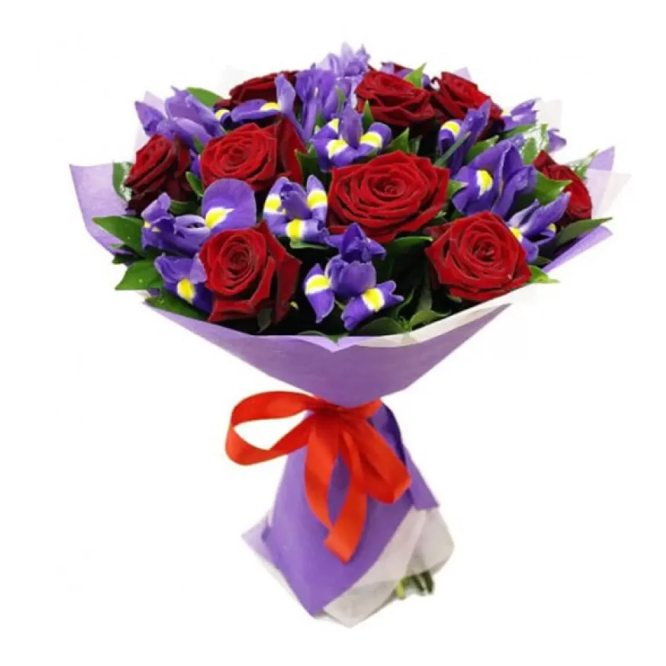 • Стандарт - роза - 5 шт., ирис - 8 шт., зелень, упаковка, лента