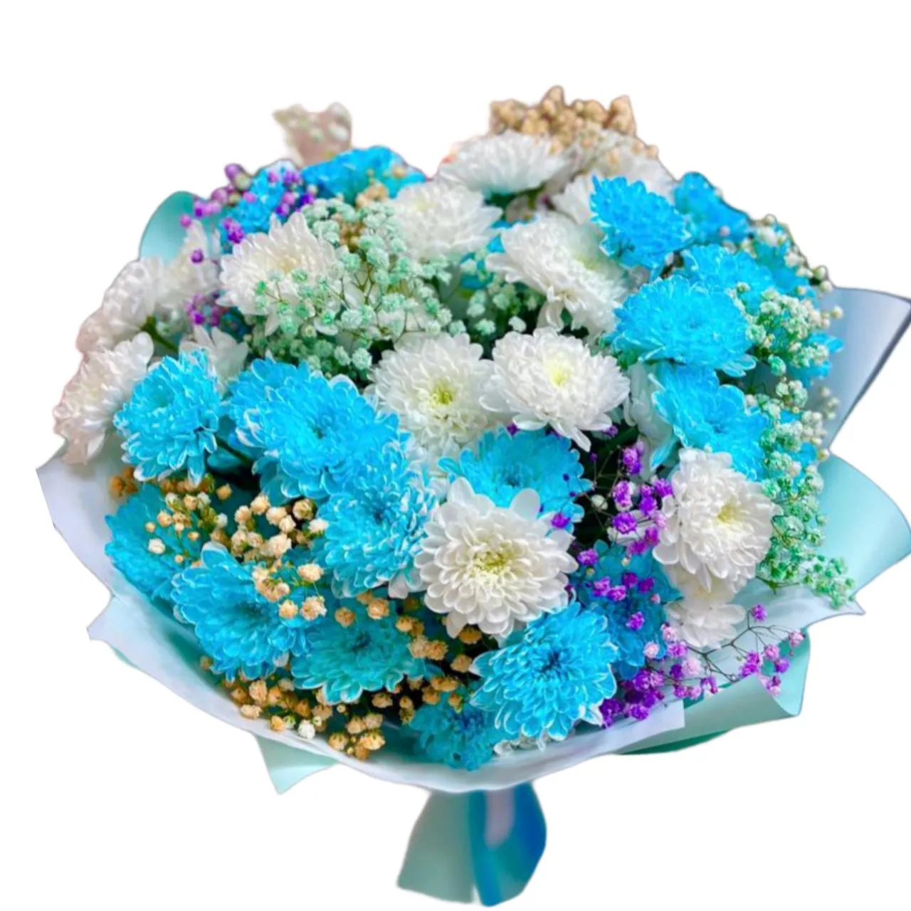 Кустовая хризантема, гипсофила, упаковка, лента